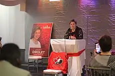 ![]() Nancy Drolet giving a speech at her campaign's inauguration | ||||||||||||||||||||||||||||||||||||||
