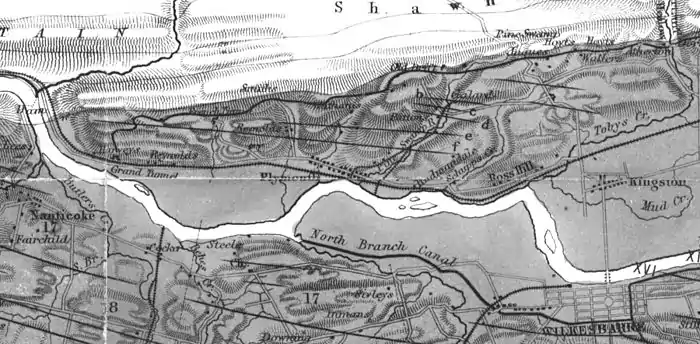 The name Nanticoke was derived from Nentego ("tidewater people"), an Algonquian-speaking Native American people who moved to the Wyoming Valley when their Chesapeake Bay homelands were spoiled for hunting by the European settlers.[4] For quite some time, the tribe maintained a village in the valley before Europeans settled there. The nearby Nanticoke Creek, also named after the tribe, was once known as Muddy Run. However, its current name was appearing on maps as early as 1776. The creek has also historically been referred to by many other names, including Lee's Creek, Miller's Creek, Robbins Creek, Bobbs Creek, Rummage Creek, and Warrior Run Creek.[5] All of these names were described as erroneous in Henry C. Bradsby's 1893 book History of Luzerne County, Pennsylvania.[5]