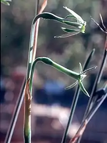 Narcissus viridiflorus possesses a number of unusual features for the genus Narcissus. It is the only species with green flowers, it flowers at night and is one of only five Narcissus species that bloom in the Autumn, rather than Spring.