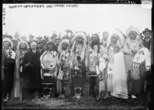 In 1908 and 1909, Joseph K. Dixon led two 'expeditions', sponsored by Rodman Wanamaker, wealthy from his involvement with the department store Wanamaker's, to visit Native American tribes as part of increasing white American interest in Native culture and efforts to "assimilate" the tribes into white American society.[1][2] The first expedition, which travelled to Crow Agency, Montana, in 1908, saw Dixon carefully direct filming and photographs in an effort to capture authentic images without "any hint of the white man's foot".[3] The following year Dixon returned to Crow Agency where directed around 100 Native chiefs to film "The Last Great Indian Council" and a reenactment of the Battle of the Little Bighorn.[4]