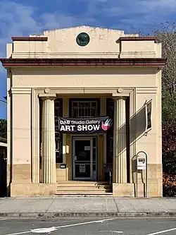 The former bank building is sited facing north on a long, narrow allotment and is a simple timber-framed building with gabled roof, given a prominent street presence through the use of a masonry facade and portico. The facade is temple-like in its symmetrical composition comprising a number of elements of classical origin including widely spaced Doric columns between plain pilasters supporting a simplified entablature and cornice. The columns and surrounding architrave have a terrazzo finish as does the exterior and portico walls to approximately one metre above ground floor level.[1]