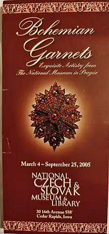 • On March 4, 2005, the museum opened an exhibition, "The Bohemian Garnets", which presented jewellery from renaissance to the present, dishes an other artifacts with the Czech national precious stone, on loan from the National Museum in Prague.[6]