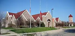 The museum was moved 480 feet (150 m) from the original site and was placed on an elevated foundation.[14] A groundbreaking ceremony was held on December 15, 2010.[8] On June 8–9, 2011, the Museum and Library, weighing around 1,500 tons (1,400 metric tons) and constructed of a wood frame with brick veneer, was moved to the new site. The building new site is 11 feet (3.4 m) higher than the previous site and 3 feet (0.91 m) above the 2008 flood level.[15] The museum dubbed the event "A Monumental Move" and set up a webcam for viewers to watch the move; the City of Cedar Rapids also shut down 16th Avenue SW, including the Bridge of Lions, so local residents could watch.[14] The museum's contractor for the job, Jeremy Patterson Structural Moving, stated that "it's apparently the largest museum ever relocated for flood hazard mitigation, and probably the only museum ever elevated."[16]