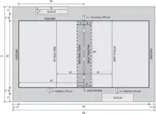 The court is divided into two 30 feet (9.1 m) by 30 ft (9.1 m) areas, with a 4 feet (1.2 m) by 30 ft (9.1 m) neutral zone located at center court separating the two sides, an attack line located parallel and 10 feet (3.0 m) from the center line, for a total court length of 60 feet (18 m) from endline to endline, and a total width of 30 feet (9.1 m) from sideline to sideline.