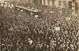The party was established on 29 November 1920 by a merger of the Liberal Party (Radoslavists), the People's Liberal Party and the Young Liberals Party.[1] However, as the three parties had previously had pro-German foreign policies during World War I, other parties were initially unwilling to co-operate with the NLP.[1] In the April 1923 elections the party received 5.3 of the national vote, but failed to win a seat.[2] The party was involved in the June 1923 coup that overthrew the Bulgarian Agrarian National Union government,[1] and went on to win seven seats in the November 1923 elections after receiving 12% of the vote.[2][3]