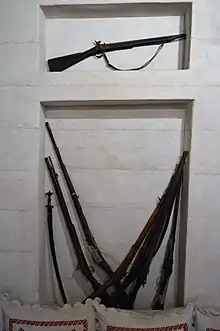 The museum's collections were partially donated by city residents and the Quwasim family.[2] The museum contains collections of pottery, archaeological illustrations, site reconstructions, and typologies dating from the Iron Age, the Sassanian period and the early Islamic period. The museum also has a collection of fishing nets.[1] The museum contains a 19th-century coin found in the Falaya Palace, where the peace treaty between the British and the Trucial States was signed, this coin is called "Mardhouf Al Quwasim". In addition, the museum contains a madbasa, an artifact used syrup 2000 years ago, a 12th-century gold coin, and 4000-year-old palm seed found at the Shamal Bronze Age settlement site.[4] The museum contains cylindrical seals from Wadi al-Qawr.[5] The museum contains a gravestone with an inscription referring to David, son of Moses, which was discovered in 1998 around the area of Shamal.[6] In October 2020, the museum launched the Tamra exhibition, about the importance and history of the date palm tree in cultural practices and heritage in the region.[7] The museum contains antique weapons and antiquities found in the Emirate of Ras Al Khaimah, in addition the museum has a special room dedicated to silverware containing a collection of silver jewelry.[8]