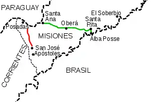 Before 1979 there was another road with this number in the province. It went from Santa Ana to the small town of Santa Rita, crossing through the town of Oberá, shown in green on the map. Federal Law #23153 of 9 November 1984 transferred jurisdiction of the road to the federal government and renamed it as National Route 103, as another route already had the number 105 on the west side of Misiones Province. It was transferred back to the province in 1993 and is today part of route 103. The paving of the section between Oberá and Alba Posse was done after the transfer.