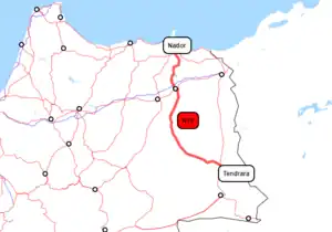 An extension of the east–west railway line in Morocco runs from Nador for 100 km to Taourirt. Most of the line follows the same route as the National road 19.