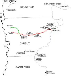 On September 7, 2004, the National Highway Authority (Dirección Nacional de Vialidad) and Provincial Highway Authority (Administración de Vialidad Provincial) signed an agreement exchanging Provincial Route 62 between Tecka and Pampa de Agnia (paved between 1974 and 1976[1]) for National Route 25 (unpaved) between Pampa de Agnia and National Route 40 (marked in green on the map). This agreement was ratified by Provincial Law 5486 promulgated on May 31, 2006.[2]