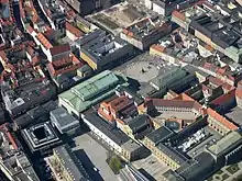 Aerial view (looking southwest) showing location of National Theatre (green roof) in relation to Max-Joseph-Platz (circle) and Residenz (right), 2007