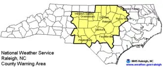 The National Weather Service Raleigh, North Carolina (RAH) is a local Weather Forecast Office for central North Carolina. The NWS in Raleigh serves 31 counties in NC and these 31 counties have a population of 7.74 million people, including the cities of Raleigh, Durham, Greensboro, Winston-Salem, and Fayetteville, North Carolina.