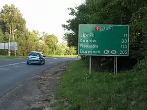 National Road 9 (Polish: Droga krajowa 9) a route belonging to the Polish national roads network. It runs from Radom, to Rzeszów.[1] The route is part of the international European route E371. In Radom the road shares a part with the National Road 12, and in Opatów with the National Road 74.[2] It is the only one-digit numbered national road for which there are no plans to build an expressway or motorway.
