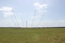 The joint American, Italian, and NATO facility houses an AN/FRT-95A Low Frequency Radio Transmitting System,[2] hosts a USAF HF SCOPE Command, part of the High Frequency (HF) Global Communications System (HFGCS)[3][4] and a US Navy MUOS Ground Station. The surrounding antenna field supports one 827 foot LF antenna, 44 HF (3–30 MHz) antennas, three MUOS Earth Terminal parabolic antennas, and 2 UHF Directional Helical antennas for satellite direction finding. Several different types of HF antenna are installed, though the majority are no longer in use. 116 Antenna towers are installed which hold aloft 35 antenna transmission lines. Antenna types include four Horizontal Log Periodic (HLPA) with 2 tall towers each, four rotatable log periodic (RLPA), seven Horizontal Omnidirectional Broadband (HOBA) each with 4 antenna towers, seven High Take-Off Angle (HTOA), 11 Dual Mode (DM) antennae held aloft with 7 towers each, 1 Spira-cone, and 10 decommissioned Horizontal/Vertical HF Loop Antennae.[5] The LF Transmitter uses non-line-of-sight propagation for communication with submarines.