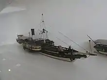 In 1832 the government tug service for the Waal was founded. It stretched from Rotterdam to Lobith.[47] The tug service was executed by NSM.[48] In 1833 the service was only profitable for NSM because Hercules had a fuel-efficient compound engine.[49] Tugboats used in the service were Hercules, Stad Arnhem and Stad Keulen.[50] In 1834 NSM built Simson.[32] In 1836 NSM made a contract with the Ministry for National Industry (Departement voor de Nationale Nijverheid) about towage upstream of Lobith. The provided loan for construction an iron tugboat led to the construction of the tugboat De Rhijn of 400 hp. For a time, the high price of British coal made that the tugs were fired with peat.[32] The tug service on the Rhine provided a very long term steady income to NSM. the government often subsidizing it by over 100,000 guilders a year. In 1841 the service upstream of Lobith was cancelled.
