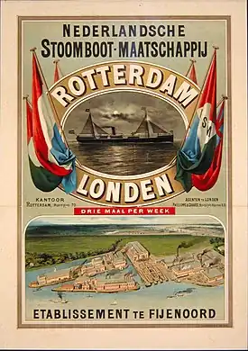 On 19 June 1839 NSM reopened its line to Antwerp.[42] In June 1846 the competing Reederij Amicitia got her first steamboat. It was an iron boat called Amicitia, built by L. Smit en Zoon with engines by Van Vlissingen en Dudok van Heel.[58] Already in December 1847, NSM agreed to end her service to Antwerp and transfer it to Amicitia.[59] In return NSM would receive 20,000 guilders a year from Smit & Veder for 10 years.[60]