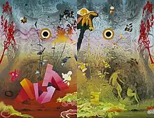 Haddon's paintings combine a wide range of influences and styles, from geometric abstraction to figuration. He has become known for using a variety of materials and techniques, from flat high gloss enamel painting to expressive oil painting. The sources for Haddon's paintings come from an array of visual media that includes local newspaper images, archival photographs of Australia and the UK,[7] and the paintings of earlier 'colonial' artists such as John Glover and Paul Gauguin.[8] His paintings have been described as "a meta-landscape mash up of samples from John Glover and Paul Gaugin and the reflectiveness of your granny's ornamental biscuit tins".[9] Kelly Gellatly, senior curator of contemporary art at the National Gallery of Victoria described Haddon's work as abstract painting that "doesn't depict a traditional landscape but is evocative in its use of darker aspects of landscape."[10] Haddon describes working from these sources as "a process of razing an image to the ground and then building back up."[7] Andrew Frost of The Guardian described Haddon's 2016 painting I Read Day of the Triffids When I Lived in England (and now I Live in Tasmania) as "a delightful post-painting nightmare."[11]