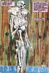 In the Blackest Night storyline, Nekron is revealed to be responsible for the creation of the black power rings, which reanimate the dead, and is collaborating with Scar and Black Hand. He's also responsible for the capture of the Anti-Monitor during the aftermath of the Sinestro Corps War on the planet Ryut. When the Black Lanterns' power levels reach one hundred percent, he rises from the Earth, just outside Coast City.[8][9] Nekron is also revealed to be the true mastermind behind the miraculous resurrections of several superheroes in the past (a deed previously thought to be a consequence of Brother Blood tampering with the forces of life and death).[10] By "allowing" the dead heroes to be reborn he grants himself a small cadre of "inside agents"; by briefly reanimating Batman's clone (created by Darkseid during Final Crisis and implying that the dark lord's awareness of the remains is not authentic) as an emotional tether to stimulate a powerful enough emotional response, Nekron is able to create black rings that latch on to Superman, Wonder Woman, Donna Troy, Kid Flash, Animal Man, Ice, Green Arrow and Superboy, transforming them all into Black Lanterns; Hal Jordan and Barry Allen are similarly targeted, but evade sharing their comrades' fates thanks to Barry taking himself and Hal two seconds into the future and causing their would-be rings to shut down.[11][12]