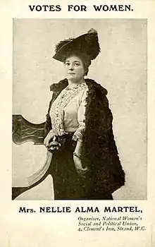 Charles returned to England in 1904 and Nellie later that year on 27 July; she remained a frequent subject of Louisa Lawson's Dawn. In London she became notorious as a woman who had stood for parliament, and joined Emmeline Pankhurst's Women's Social and Political Union (WSPU) in May 1905. Martel read a petition of protest at a meeting following the delay of a women's enfranchisement bill, and became a member of the WSPU's central committee in 1906, publicising the democratic rights enjoyed by Australian women.