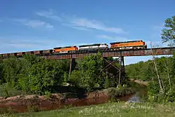 The Nemadji River is a river rising in Pine County, Minnesota, United States, which flows through Carlton County, Minnesota, and Douglas County, Wisconsin, to Lake Superior.[1] The river is 70.8 miles (113.9 km) long measured from its source in Maheu Lake in Pine County, and 34.9 miles (56.2 km) from its confluence with the South Fork in Carlton County just east of the Minnesota-Wisconsin border.[2] The Nemadji River empties into Lake Superior in an industrial neighborhood at Allouez Bay in the city of Superior's east-side neighborhood of Allouez and Wisconsin Point.