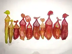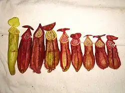Rosette and lower pitchers are ovate in the basal third of the pitcher cup and narrower above. They measure up to 16 cm in height by 5 cm in width. The hip is located near the middle of the pitcher. A pair of wings (≤6 mm wide) runs down the ventral surface of the pitcher cup, bearing narrow fringe elements. The pitcher mouth is oval and has an oblique insertion. The peristome is cylindrical and up to 10 mm wide at the sides, with teeth up to 1 mm long. The glandular zone of the inner surface extends for about half of the pitcher's height. The pitcher lid or operculum is orbicular to broadly ovate. It is often somewhat vaulted and has a cordate base. It measures up to 4.5 cm in length by 4.5 cm in width, being larger than the pitcher orifice. The lower surface of the lid does not have any appendages, but bears numerous crater-like glands (≤1 mm in diameter), the largest of which are located around the midline. A spur (≤7 mm long) is inserted near the base of the lid. It is typically simple, but may occasionally be branched. On their outer surface, terrestrial pitchers are typically green to orange with red stripes, or red throughout. Red blotches are present in the waxy zone of the inner surface. The colour of the peristome is highly variable and may be green, white, orange, or red. The lid ranges in colour from orange to red, and bears fine red streaks.[1]