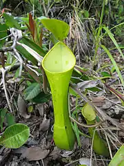 Upper pitchers are typically somewhat infundibular in the lowermost part, becoming narrowly ovoid in the lower third, and finally cylindrical and slightly narrower above. They may be quite large, reaching 25 cm in height by 5 cm in width.[5] The waxy zone of the inner surface is well developed.[8] A pair of remnant ribs is present in place of the ventral wings.[5] The inner portion of the peristome accounts for around 40% of its total cross-sectional surface length.[8] Other parts of aerial pitchers are similar to their lower counterparts.[5]
