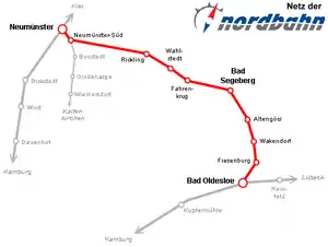 The Neumünster–Bad Oldesloe railway is an approximately 45-kilometer-long single-track, non-electrified main line in the German state of Schleswig-Holstein. It connects the central Holstein town of Neumünster with Bad Oldesloe, the seat of the district of Stormarn. Since December 2002, passenger services on the line have been operated by Nordbahn Eisenbahngesellschaft.