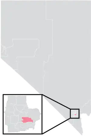 The district overlaps with Nevada's 1st and 3rd congressional districts, and with the 18th and 20th districts of the Nevada Assembly.[4] It has a surface area of 27 square miles (70 km2), and a perimeter of 31.5 miles (50.7 km).[5]