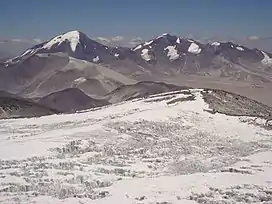 Tres Cruces Massif from Ojos del Salado, looking west. Center, Nevado Tres Cruces Central. Left, Nevado Tres Cruces.