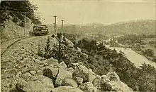 The line started from the heart of the manufacturing center of Reading to the very pinnacle of Neversink. The physical conditions of the route proposed and demanded by travelers was daunting. The twelve-mile railway followed a grade of 3.4 to 6.4 per cent, running along the path of an electric motor through a series of curves and one switch-back. After reaching the top, the railroad wound its course down the other side to Klapperthall Park, passing pleasure resorts and picnic grounds through the Schuylkill River valley.[1]