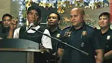 In a speech during his visit to police officers wounded or killed in the ongoing war against drugs on August 29, 2016 in Tacloban, President Duterte called for the senator to resign and said "If I were De Lima, I'll [sic] hang myself."[32][33] While admitting there were "snippets of truths" in those allegations, De Lima however said "the bulk of it are distortions, exaggerations, and lies."[34][35] The senator also said she will not take part in any inquiry on the Bilibid drug trade.[36] Congressman Espino also denied the allegations.[37]