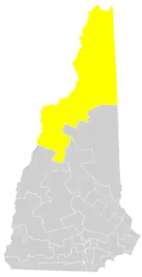 District 1 covers far northern New Hampshire, including the Great North Woods region bordering Canada. It is located entirely within New Hampshire's 2nd congressional district.[4] It borders the states of Maine and Vermont, as well as the Canadian province of Quebec. At over 2,500 square miles, it is the largest state legislative district in New Hampshire.[1]