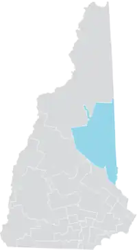 District 3 covers all of Carroll County and small parts of Grafton and Strafford Counties in the central-eastern portion of the state. It includes the towns of Albany, Bartlett, Brookfield, Chatham, Conway, Eaton, Effingham, Freedom, Hale's Location, Hart's Location, Jackson, Madison, Moultonborough, Ossipee, Sandwich, Tamworth, Tuftonboro, Wakefield, and Wolfeboro in Carroll County; Waterville Valley in Grafton County; and Middleton and Milton in Strafford County.[3]