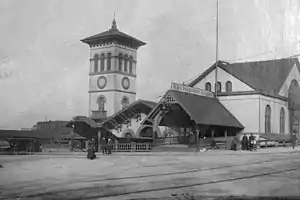 The 106-foot (32 m) tall front of the Italianate-style railway depot located on Capitol Hill was dominated by a four-sided clock tower that rose 100 feet (30 m). The station was 68 feet (21 m) deep, according to the Baltimore American. The inside of the station was a beautiful hall that passengers passed through to get to their trains. The station included a B&O ticket office, a freight office and ladies and gentlemen's saloons. Just to the north was the main carhouse, which was 60 feet (18 m) wide and 330 feet (100 m) in length; its iron roof was supported by granite pillars.[12]