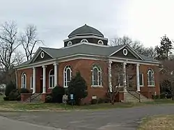 In 1920, a white frame church was demolished and the current circular brick church was constructed. The architect was Frank Estes, although the work was completed by another contractor.[2][4] The church's architecture reflects two key influences: Andre Palladio's 16th-century Villa Capra, and the "Akron Plan," which was created in the late 1800s by the Methodist Church of Ohio. The Palladium Italian Renaissance influence is evident in the central dome and in the main north and east facades. The influence of the "Akron Plan," by contrast, can be seen in the quarter-circular auditorium surrounded by four Sunday school alcoves.[4]