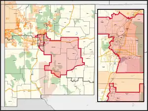 New Mexico's 1st congressional district of the United States House of Representatives serves the central area of New Mexico, including most of Bernalillo County, all of Torrance County, and parts of Sandoval, Santa Fe and Valencia counties. It includes almost three-fourths of Albuquerque. The district has a notable Native American presence, encompassing several pueblos including the Pueblo of Laguna and Sandia Pueblo, and the Tohajiilee Navajo Reservation outside Albuquerque.[4] The seat is currently represented by Democrat Melanie Stansbury. With a Cook Partisan Voting Index rating of D+5, it is the most Democratic district in New Mexico, a state with an all-Democratic congressional delegation.[3]