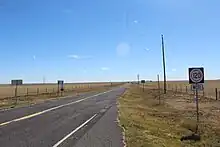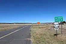 Crossing the Canadian River bridge the road enters Harding County and then heads north-northeast about 8 miles (13 km) into the town of Roy.[4] The road comes into Roy as the Wagon Mound Highway, then zags up to Second Street and then up to Third Street where it intersects with Route 39. Then heading three blocks east as Third Street, the road turns due north as Floersheim Street and leaves Roy as the Yates Highway. Running along section lines the road heads north and east intermittently, passing numerous ranch roads and going through part of the Kiowa National Grassland which is predominately north of the road,[6] for 27 miles (43 km) to the community of Yates. Four miles (6.4 km) later heading due north the road passes into Union County.[4] After 12 miles (19 km) in Union County headed mostly north, but still on section lines, the road terminates at its intersection with U.S. Route 56 and U.S. Route 412 8 miles (13 km) east of Gladstone.[4] A dirt road continues north at that point for a couple of miles into the Don Carlos Hills.[4]