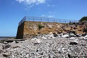 The station became redundant in 1886 following construction of the Severn Tunnel, and was closed.[9][10] The pier was demolished by 1888.[1] A plaque now marks the site, and although the building of new piling for flood defences and new concrete castings mean there is little to no trace of the railway on the land side, at low water, some remains of wooden piling can be seen below the plaque site.