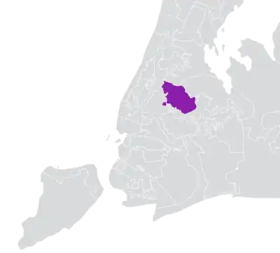 The district overlaps with New York's 6th and 14th congressional districts, and with the 27th, 30th, 34th, 35th, 36th, and 39th districts of the New York State Assembly.[5]