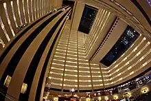 The elevator core is made of concrete and is rounded in shape,[30][37][38] with a form similar to a minaret.[39][40] It was manufactured by Collavino Brothers.[31] The core measures 55 feet (17 m) wide and carries twelve passenger elevators on its exterior, as well as four elevators at the center.[40] The exterior elevators are surrounded by glass and overlook the atrium lobby.[31] The cabs are enclosed by glass and have fiber-optic lighting.[16] The elevator system, supplied by Schindler, has a destination dispatch system, which assigns passengers to elevator cars according to their destination floors.[41][42] The destination-dispatch system was completed in 2006[41][43] and modernized in 2019.[44] Six additional elevators are used by service staff.[43][22]