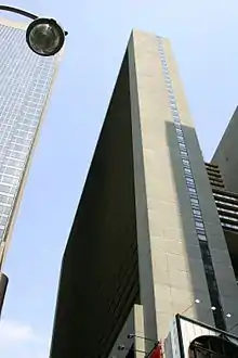 The facade is made of gray precast concrete panels with vertical stripes, which were manufactured by Canadian company Prefac-Vibrek. The lower stories' panels were installed using cranes, while the upper stories' panels were installed with a monorail assembly.[31] The precast panels are hung from steel beams that are placed around the hotel building's perimeter. Some openings were also made in the facade so exterior signs could be attached to it.[29] The windows are recessed deeply into the concrete panels, a design similar to a Venetian blind.[30]