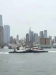 The New York Tugboat Race is a contest for working tugboats held on the Hudson River every Fall on the Sunday before Labor day. It was founded in part by Captain Jerry Roberts, who also serves as its chief announcer.[1] Boats race one nautical mile from 79th Street to Pier 84 at 44th Street in Manhattan. The race is the occasion for a dockside festival.[1] Events currently include nose-to-nose pushing competitions, a line toss competition, and best mascot/costume contests between the crews.[2] After the award, the spectators of the race can compete in events that include a knot tying competition, an on land line toss competition and a spinach eating competition. The spinach eating competition is in honor of the Popeye the sailor cartoon character. Spectators can also pay to get a seat on a tug boat during the events.[3]
