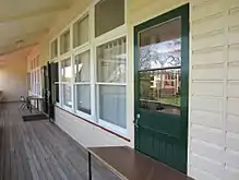 The verandah has timber floors and large sections of bag rack balustrades. Part of the western end of the verandah is enclosed with chamferboard-clad walls, while the full extent of the verandah to the eastern DPW section is enclosed by chamferboards and areas of louvres above bag racks. Sections of early, horizontal timber rail balustrades survive in places, including to the western and central stairs. Original timber screens with square glass panes from the B&P section survive: two panels relocated to the far western end of the verandah, and one panel at the eastern end of the B&P section. The verandah ceilings are raked and lined with flat sheeting, with bulkheads between the B&P and DPW sections. The B&P section has exposed rafters aligned with joins in the wall panels. Verandah windows are timber-framed, double-hung windows with awning windows above. Surviving verandah doors include: half-glazed, timber double doors to the western DPW section and passageway of the eastern DPW section; and a half-glazed, single timber door to the B&P section.[1]