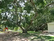 The school grounds contain mature trees, including two large fig trees (Ficus, sp.) along the Banks Street boundary, in front of Block A, and a row of four large fig trees and a kauri pine north of the tennis courts (along the former police reserve boundary), some of which, according to aerial photos, were planted prior to 1936. A mature Grey Gum (Eucalyptus sp.) is located to the west of Block B.[1]