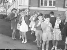 The levelling and clearing of Newmarket State School's grounds was an ongoing project during the 1930s. Past students recalled that men were employed on the excavation of the Newmarket State School oval and filling the gully, under the Unemployment Relief Scheme. In 1932, three men were given two days' relief work clearing lantana and stumps from the school grounds.[10][27] A concrete cricket pitch was completed in 1932, laid down entirely by voluntary labour and was subsequently available for hire to the public.[28][29] Fundraising fetes and balls for the beautification of the school surroundings took place.[30][31] During 1933 the School Welfare Association raised £600 for school improvements.[32] In 1939 two new tennis courts were opened.[33][1]