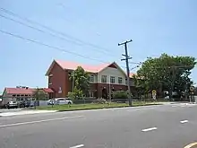 Newmarket State School occupies a 3.9-hectare (9.6-acre) site on the corner of Enoggera Road and Banks Street in the suburb of Newmarket, five kilometres northwest of the Brisbane CBD. The school buildings are located along the southern boundary, parallel to Banks Street, at the highest point of the school grounds, which slope down from Banks Street towards the north. A steep, rocky bank separates the school buildings from a playing field, which occupies the northwest portion of the grounds. The site is bounded by residential properties to the west and north, with a small section of the northern boundary adjacent to Kate Street and an entrance from Trackson Street. A former police reserve and house occupies the corner of Enoggera Road and Kate Street (now a private residence). The most prominent building on the site is a Depression-era brick school building (Block A, 1934, extended 1947) which fronts Banks Street. Behind Block A is a block of 1950s timber classrooms (Block B, 1954, 55, 56), of which the central pair are an imported Boulton & Paul building. The school grounds contain a number of significant mature trees, and landscaping features include earthworks, assembly and play areas, sporting facilities, and paths.[1]