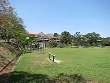 Changes to the school grounds have also occurred since WWII. These included the construction of stairs to the oval (the current concrete stairs date from the 1960s, replacing an earlier set).[95][96] Additions made to the Newmarket School Reserve when it increased to 8 acres (3.2 ha) 13.1 perches (330 m2) in 1963-4 included the extension of the playing field to its west, as part of works relating to the opening of the Newmarket State High school. Much of the bank excavated during the 1930s along the southern edge of the oval was removed or altered at this time.[97][98] New tennis courts and a shelter shed were completed between 2002 and 2004.[99][93] More recent buildings added to the school grounds are located along the Banks Street boundary and around former netball courts in the southeast corner. In the area in front of Block A's entrance portico garden beds have been created, early paths have been paved or laid with bitumen, and several memorials have been established.[94][1]