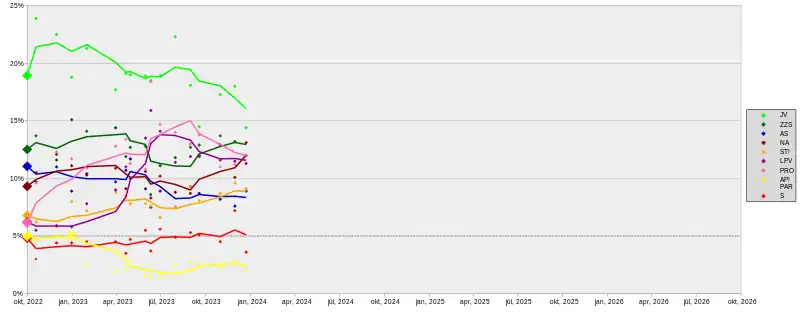| SKDS/LTV[5] | July 2023 | 1,805 | 22.3 | 11.8 | 7.5 | 8.8 | 7.5 | 11.4 | 14 | 2.5 | 2 | 4.9 | 0.4 | 1.2 | 2.1 | 2.6 | 1.3 | 8.3 |