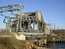 The main bridge structure, a 68-foot (21 m) Scherzer through-girder bascule design, was built by the King Bridge Company in 1907 for the New York, New Haven and Hartford Railroad.[3] The bridge was known as "Old Nan" and cost about $48,000. Overall, it was 294-foot (90 m) long with five spans resting on stone masonry piers and abutments. Remnants of the bridge were donated to the Connecticut Eastern Railroad Museum.[4]
