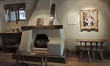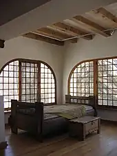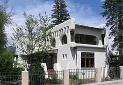 The Nicolai Fechin House in Taos, New Mexico, is the historic home of the Russian artist Nicolai Fechin, his wife Alexandra and daughter Eya. After purchasing the house in 1928, he spent several years enlarging and modifying the two-story adobe structure, for instance, enlarging the porch and adding and widening windows to take advantage of the views. He carved many of the fittings of the house and its furniture, using typical Russian design elements such as "triptych windows and intricately carved doors."[2] The whole reflects a modernist sensibility combined with Russian, Native American and Spanish traditions.