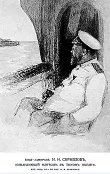 His correspondence from there was published in the journal New Time and attracted a lot of attention. All his impressions about this trip were collected in his own illustrated book: To China (St.Petersburg, 1904).[2] After returning from a trip, Kravchenko was honored to be invited to Livadia, where he demonstrated to the Sovereign a report on his journey in the form of several hundred studies, drawings and sketches, which illustrated battlefields of 1900, types of soldiers and Chinese, views of Beijing and many other items. With the outbreak of the Russo-Japanese War, Kravchenko went to the Far East and was a witness of the death of battleship Petropavlovsk in Port Arthur, which he captured and vividly described in New Time. Kravchenko's painting "The death of the destroyer Petropavlovsk on Japanese mines" is situated in exposition of the Central Naval Museum of St. Petersburg. At the theaters of war, Kravchenko did not stay very long. His impressions about the events of the Russo-Japanese War are described by him in the book To the War (St. Petersburg, 1906).The events that he reproduced in a series of drawings that are placed in the «Manchuria» albums of the artist Martynov, in the «Chronicle of the War with Japan», in edition by D. N. Dubensky's and in the Chronicle of the War with Japan on land and at sea edition by V. Berezovsky's . By the order of the Russian Emperor, Kravchenko completed a large portrait and a half-length portrait with the help of colored pencils. This portrait was brought to Nicholas II.[1]